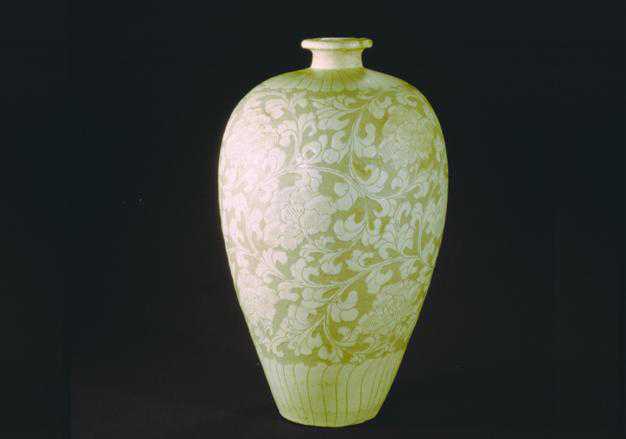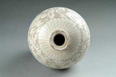 白釉剔花梅瓶大体略呈橄榄形,圆唇,平沿外折,短直颈,丰肩,腹部下收,平底。此器工艺为胎地着白色化妆土,再划刻纹样,然后将纹样轮廓之外的部分剔除,剔地之后展现出凸感的纹样,最后罩透明釉,入窑烧制成品。灰褐色胎地衬托着凸出来的白花,立体感强。灰褐色与白色相对应,温润雅洁。腹部装饰剔刻花缠枝牡丹纹,肩部与腹下部刻菊瓣纹,纹样精美,刀法遒劲,线条流畅,系宋金时期当阳峪窑剔花工艺的代表之作。