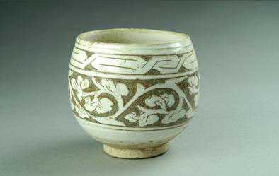 白釉剔花牡丹纹罐,宋代,高12.4厘米,口径10.8厘米,底径7.5厘米。现藏于洛阳博物馆。圆唇,侈口,短束颈,圆鼓腹,圈足。罐腹部剔刻牡丹花及枝叶,颈部剔刻带状锯齿纹,花朵、枝叶上又装饰箅纹。