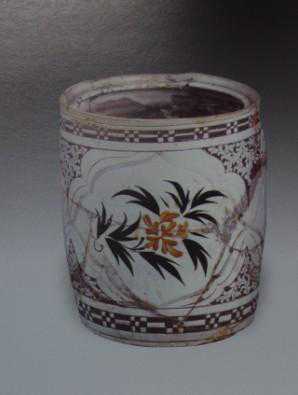 焦作市王封乡西王封村出土的白釉剔花开光彩绘折枝牡丹纹缸,宋代,高24.5厘米,口径20.4厘米,底径19厘米。现藏于焦作市博物馆。敛口,内折沿,筒腹,矮圈足。胎呈灰色,内外饰釉。器表采用剔花工艺与彩绘相结合的装饰手法,腹部主体纹饰为三组花瓣形开光图案,内用黑彩绘枝叶,黄褐彩绘牡丹花,空余部位用剔刻卷草纹补白,口沿及腹底部分别以带状剔刻几何纹装饰一周。