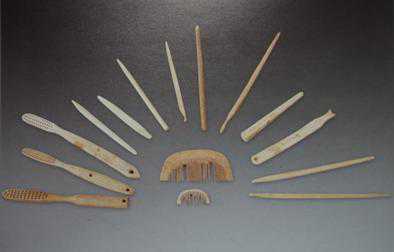 剔、刻、划花工具,宋,现藏于焦作市博物馆。一组15件,皆为骨质,可分为六种类型。一类为扁平形,中间宽厚,两端渐窄。一类为扁平片形,中间宽,两端渐窄,其中一头向上翘起。一类为圆柱形,一端尖圆,有磨损痕迹。一类为方柱型,方形平顶,另一端呈锥状尖锐锋利。一类为扁方形,一端上有一格圆孔,另一端有多个小孔,应为安装鬃毛,清刷剔划花时候残留的碎屑所用。一类为梳子形状,分大、小型,为箅划工具。