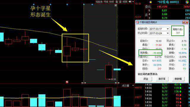 2、孕十字星出现在上涨过程中,有见顶的信号,出现在下跌过程中,有见底的信号
