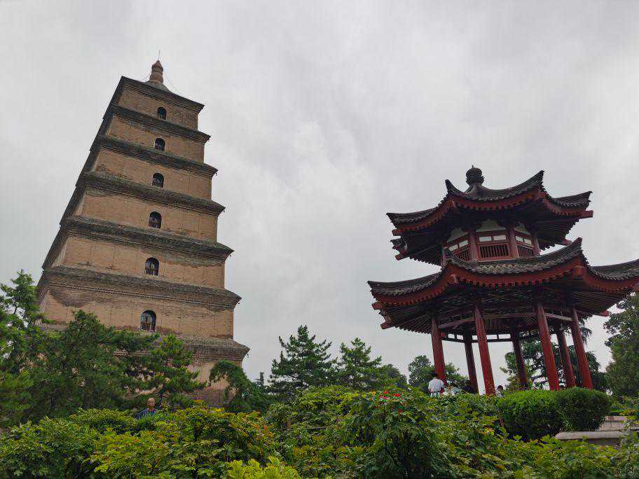 法堂的背后就是举世闻名的大雁塔了。大雁塔始建于唐高宗永徽三年,即公元652年,是由玄奘亲自设计并督建的,用以保存他从印度带回的佛经与佛像。