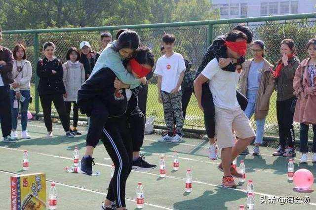 游戏规则:男女组合,男生背女生,男生当“瞎子”用纱巾蒙住眼睛,女生扮“瘸子”为“瞎子”指引路,绕过障碍物到达终点,做早到达者获胜。其中,路障设置可摆放椅子,需绕行;气球,须踩破;鲜花,需拾起,递给女生。