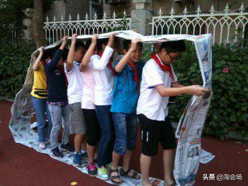 每队六人要求游戏开始后先共同站在一张报纸上,各人身体的任何部位,不得碰地,成功后再撕去一半报纸站,接着再撕去一半……直至失败,最后以最佳办法能站进最小报纸的队为胜。