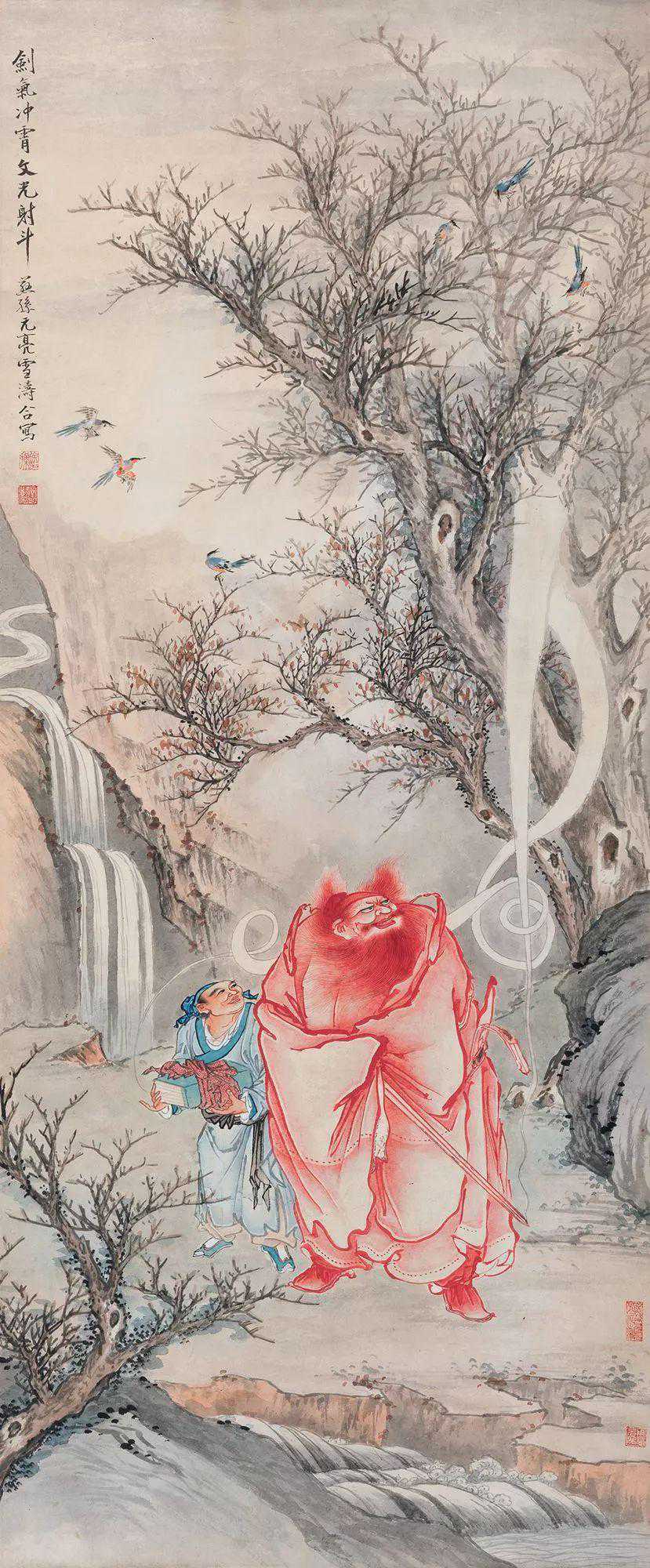 这是1940年前后三位大师合作的作品,见证了艺坛佳话。图中山水应为周元亮所绘,钟馗与童仆则是徐燕孙的手笔,王雪涛笔下的雀鸟是这片寒林中难得的亮色。他们的同台献艺十分成功,山水、花鸟、人物毕于一幅,如浑然天成。