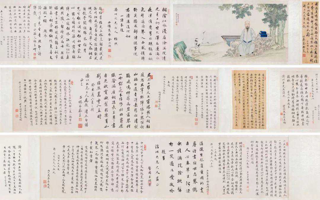 这是清代嘉庆、道光年间盛行的庭园肖像画,展示出文人士大夫寄情于自然的闲暇生活。画作前后多达十余人的题赞,多为当时的进士、举人,如蔡之定、蔡夔等颇有声名,令此作除艺术性之外,又增添了历史文献价值。