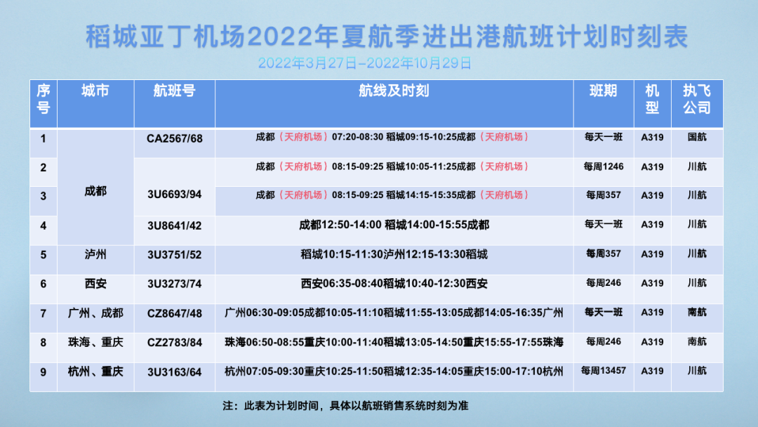 2022年3月27日起,稻城亚丁机场将开始执行夏航季进出港班计划时刻表,请大家留意航班变化,及时调整出行安排!