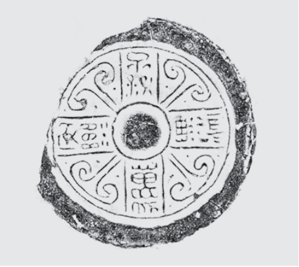 西汉时,齐地的圆瓦当开始增多,在大一统历史背景下,大量的圆瓦当开始使用与陕西关中秦汉云纹瓦当相同的卷云纹,其当心纹饰亦仿前者(图8)。到了东汉,圆瓦当当心以圆饼为主,当面多为蘑菇形和羊角形云纹,有的瓦当云纹之间并有文字,形成云纹与文字相结合的瓦当(图9)。