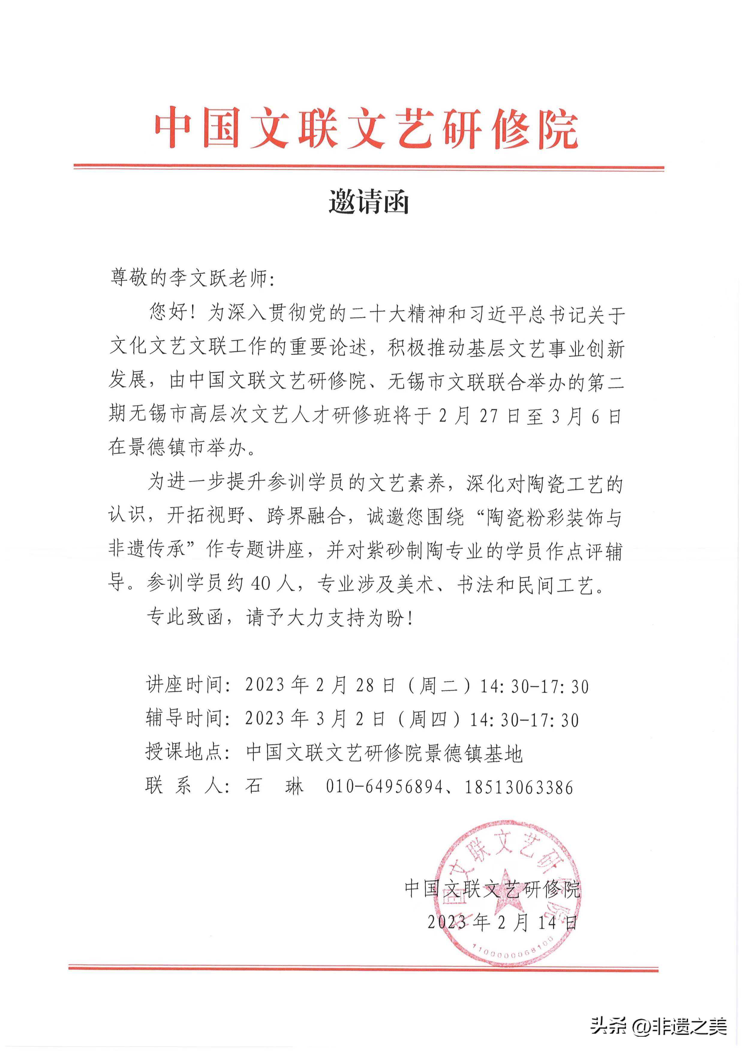 【编者按】为增强学员的专业素养和创作能力,2023年2月28日至3月2日,由于中国文联文艺研修院、无锡市文联联合主办的第二期无锡市高层次文艺人才研修班邀请李文跃等老师进行专题讲座,并按专业领域进行分组辅导。2023年2月28日下午,中国非物质文化遗产保护协会陶瓷分会副会长李文跃教授作了题为《陶瓷粉彩装饰艺术与非遗传承》的专题讲座。他以粉彩瓷起始渊源为切入点,首先详细介绍了这一重要陶瓷装饰艺术的发展历程,接着全面剖析了新中国成立以来粉彩瓷在工艺材质、瓷绘主题思想、艺术表现形式、时代精神表达等方面的开拓创新,最后他以粉彩非遗传承为例,生动阐述了景德镇传统手工制瓷技艺非遗传承的发展与进步。