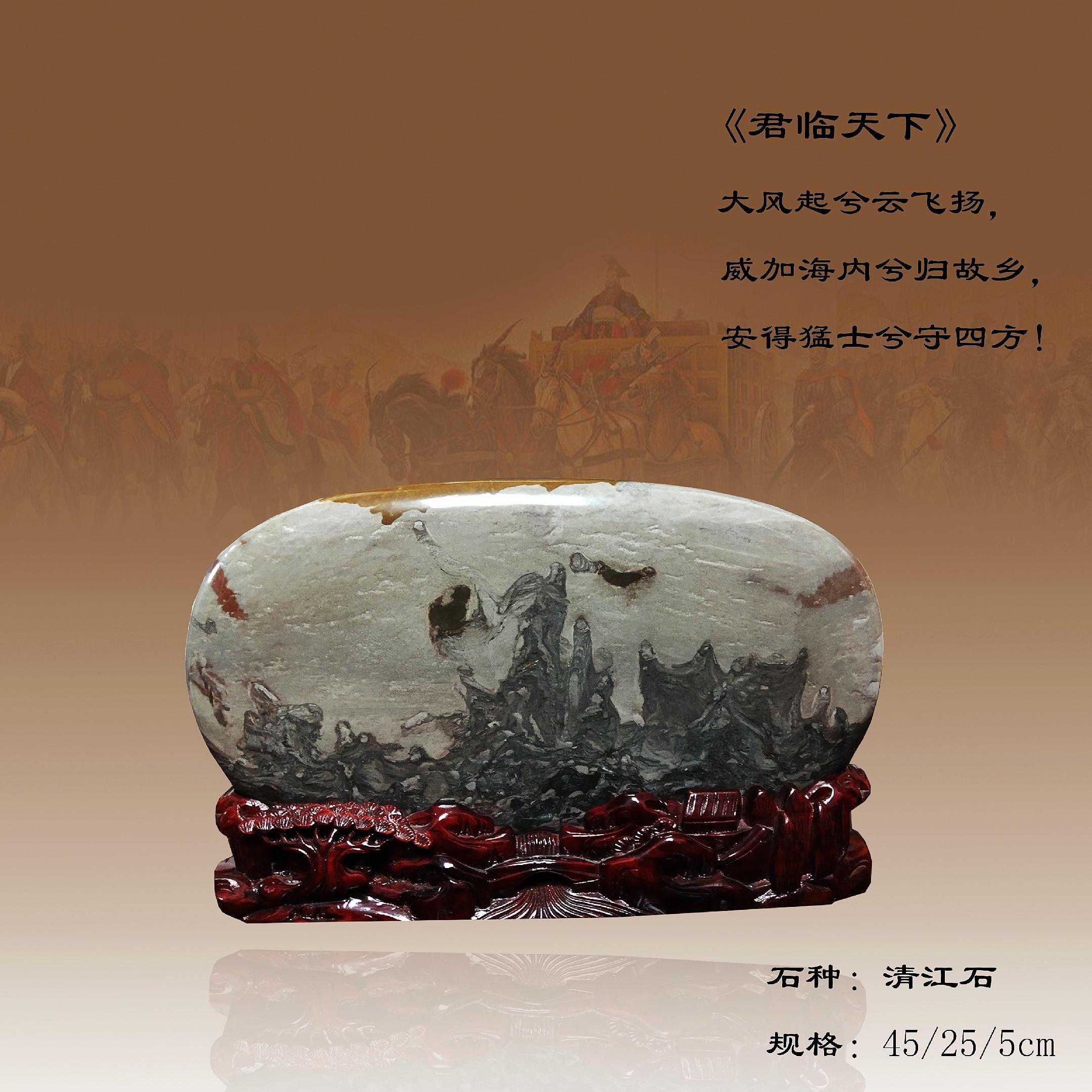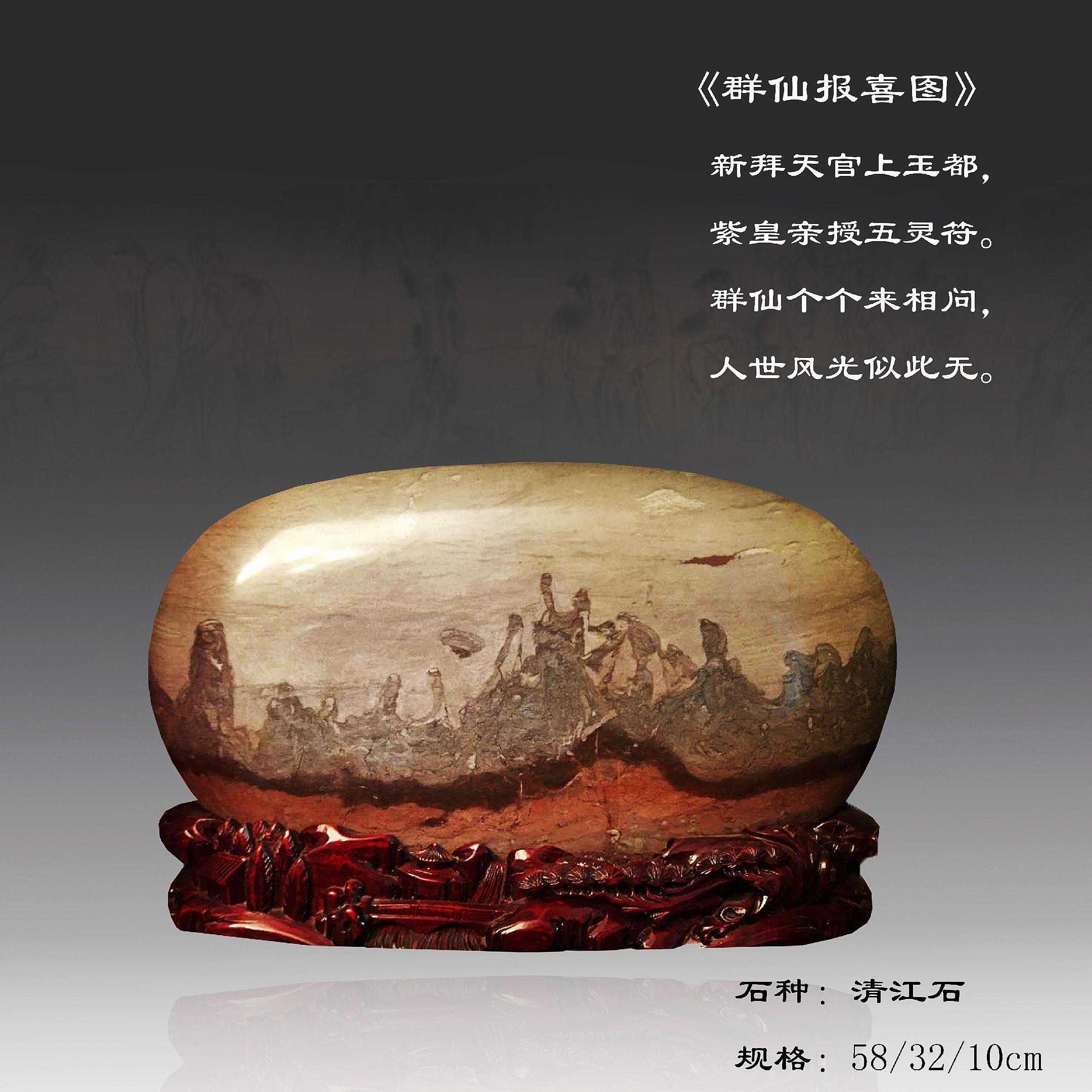 20年前,老刘又与奇石结缘,成为中石协创会时的初始会员,老刘收藏石头不计较石种,只要美,只要观赏主题自然天成、稀缺,形成难度大,能读出文化,品出故事,价高点也行,只要拿得动一定拿下,如果买不到手就会吃不香,睡不着。一次在洛阳石展上看到一方清江石,价高缺银子,就同卖方朋友协商,可否暂欠一部分,卖方欣然同意。石头拉回老家后,老刘立马带上早年收藏的纪念金币,急奔北京马甸市场转让还款。第二年还是在洛阳石展上,他又看上了一方大块清江画面石,后命名《群仙赴会》,因色彩、纹路都非常奇绝,寓意也好,可遇而不可求,但还是缺钱,没办法,老刘只好在石展上直接往美国打电话,让在美国斯坦福大学读研的儿子把他在学校贷的学费打10万过来,儿子说不买不行吗?老刘说全世界就此一方,我想买,错过了就再难遇上,钱以后可以再赚,同样的石头再找不来。儿子很孝顺立马给打了5万过来,老刘终于得偿所愿,满载而归。但后来老刘还是有点难受:为了自己的爱好不顾孩子的学习,我是不是有点太自私了。