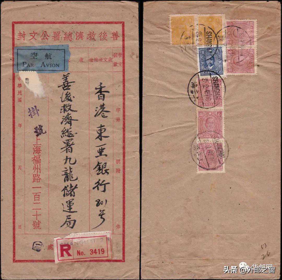 图10是上海24支局1946年2月23日-香港航挂(图1),由“善后救济总署”寄香港东亚银行801号“善后救济总署九龙储运局”,可见证抗战余音。