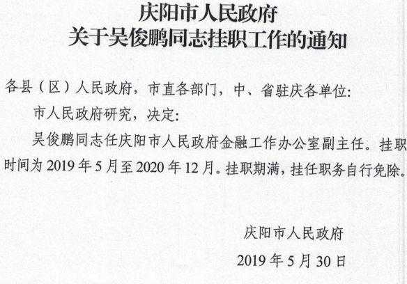 吴方敏任天水市生态环境局副调研员,免去其天水市环境保护局副调研员职务;