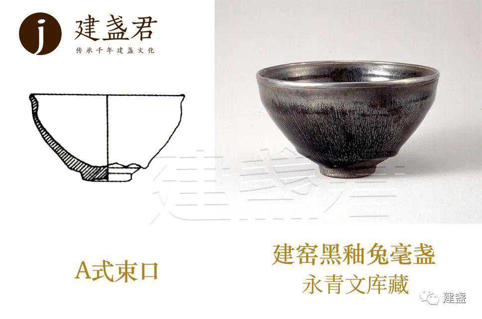 日本永青文库所藏的建窑黑釉盏即为典型的A式束口盏,口径12.6cm。灰黑胎、腹部饱满,漆黑的底釉展现泛光的银兔毫。口沿银扣,更显得贵气典雅。
