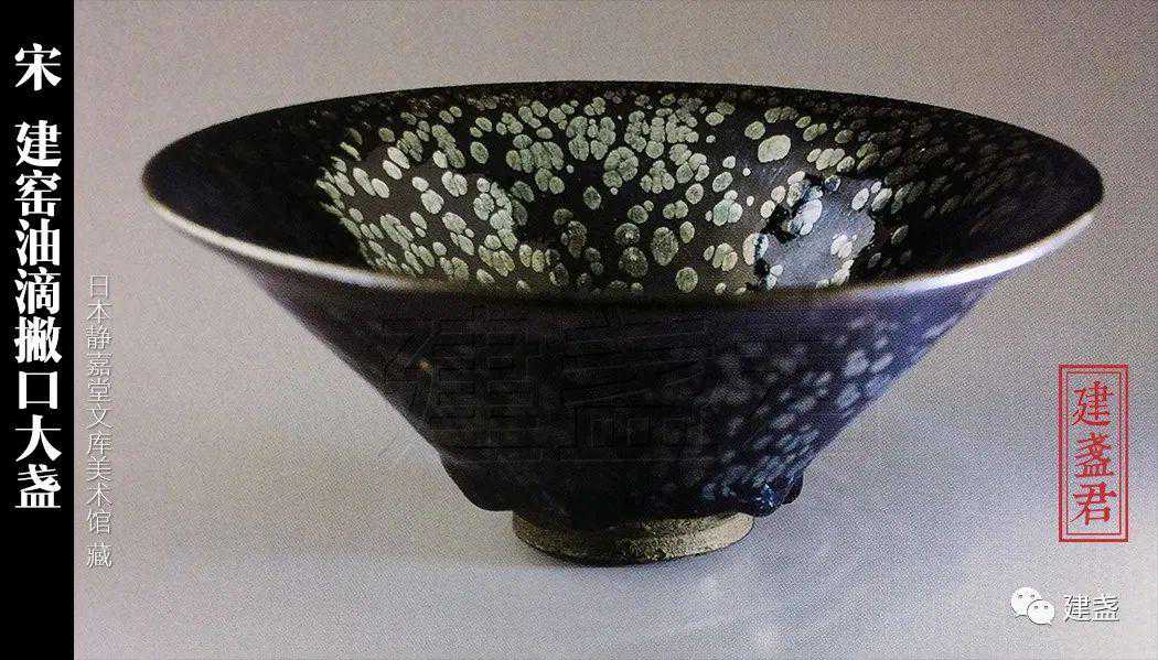 ▲该只撇口油滴盏是日本重要文化遗产,口径19.7cm,属大器型,器型周正,清晰、硕大的油滴斑随着外撇的盏壁铺面开,难得上品。
