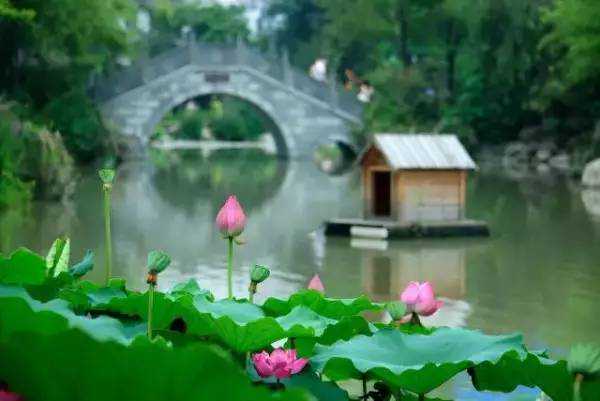 福建农林大学的中心是观音湖,暮春立夏,一池荷花亭亭玉立,横卧湖中的春晖桥倒映水中若隐若现,幽静的湖心岛成了镶嵌在绿波上的璀璨珍珠。