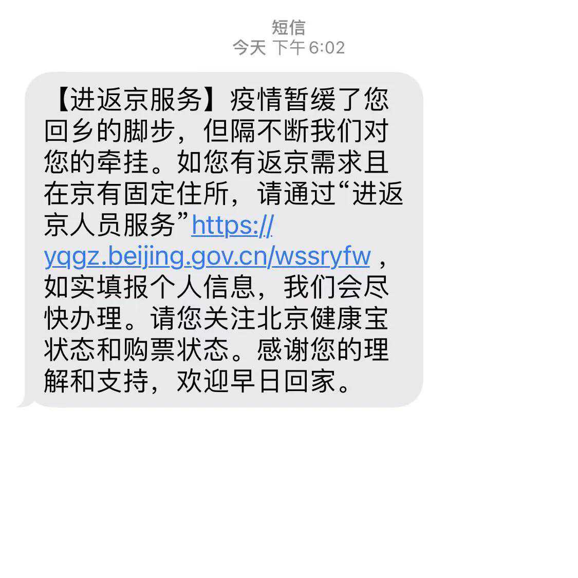 3,第三步:如果审核通过,先是健康宝的弹窗就解了。阿姨这次通过比较顺利,早上提交的申诉,提交不到半天后北京健康宝弹窗就没有。接着,按照攻略说的,当天晚上接到了12345的电话。第二天早上收到了进京申请的短信链接。据说短信链接第一次有时候会无法填写,这个时候多刷几次就好了。进入短信链接填写好进京申请后,大概又过了几个小时,接到了社区来电,审核通过,可以买票进京了。社区说只有12345审核通过过,进京申请才会推送到社区。之前社区是看不到这个进京的信息的,所以如果12345弹窗没有解,给社区打电话也是没有什么的用的,因为解这个弹窗的权限不在社区。