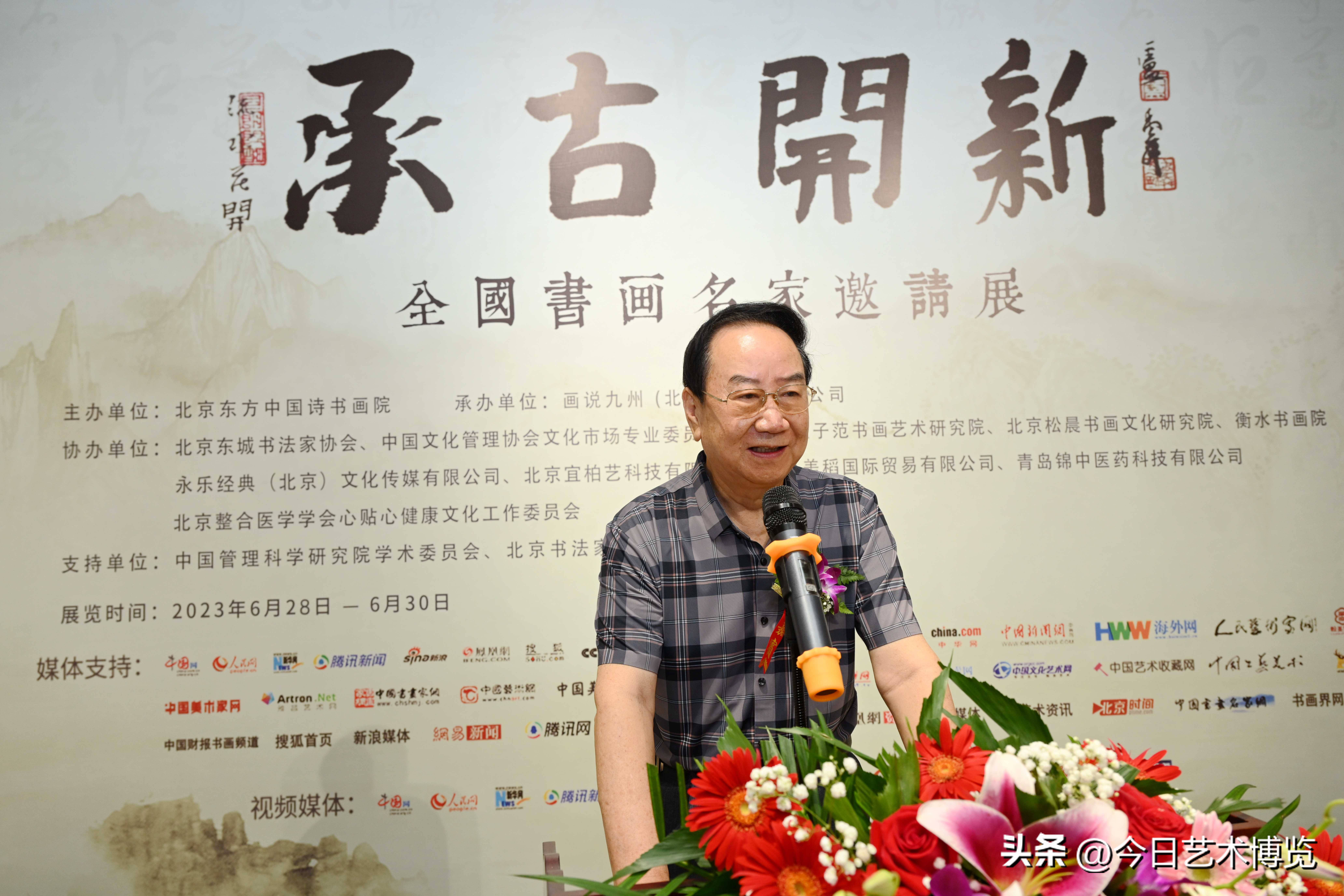 6月28日下午3时,由北京东方中国诗书画院主办;画说九州(北京)文化有限公司承办;北京松晨书画文化研究院、崔子范书画艺术研究院、北京宜柏艺科技有限公司、永乐经典(北京)文化传媒有限公司、青岛美稻国际贸易有限公司、青岛锦中医药科技有限公司协办的“承古开新·全国书画名家邀请展”在北京炎黄艺术馆盛大开幕。开幕式由中国书法家协会理事、北京书法家协会副主席田伯平主持。