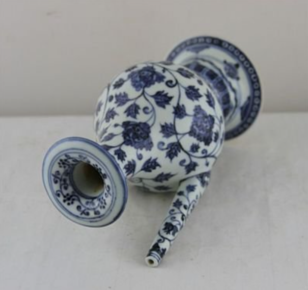 藏品的特点和特色:这件青花军持长18cm,宽12cm,高21cm。它的头部形状类似扁蒜头,口略内敛,有长颈、球状腹和圈足,肩处有一乳状流。器腹以青花线条开光,饰以花卉条纹图案,展现了明代中晚期写意画风格。
