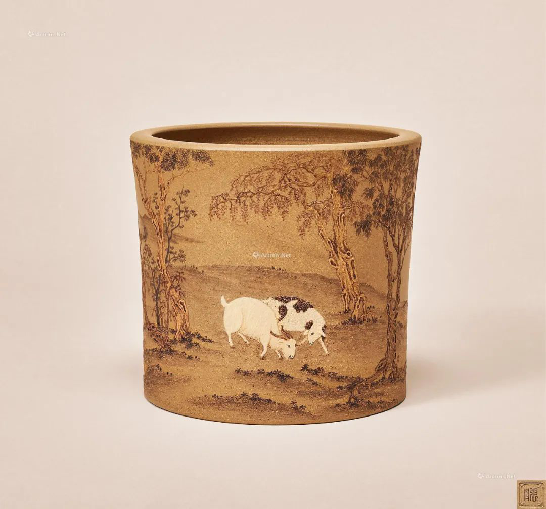 0057张丹当代秋郊牧羊图紫砂五彩堆泥笔筒