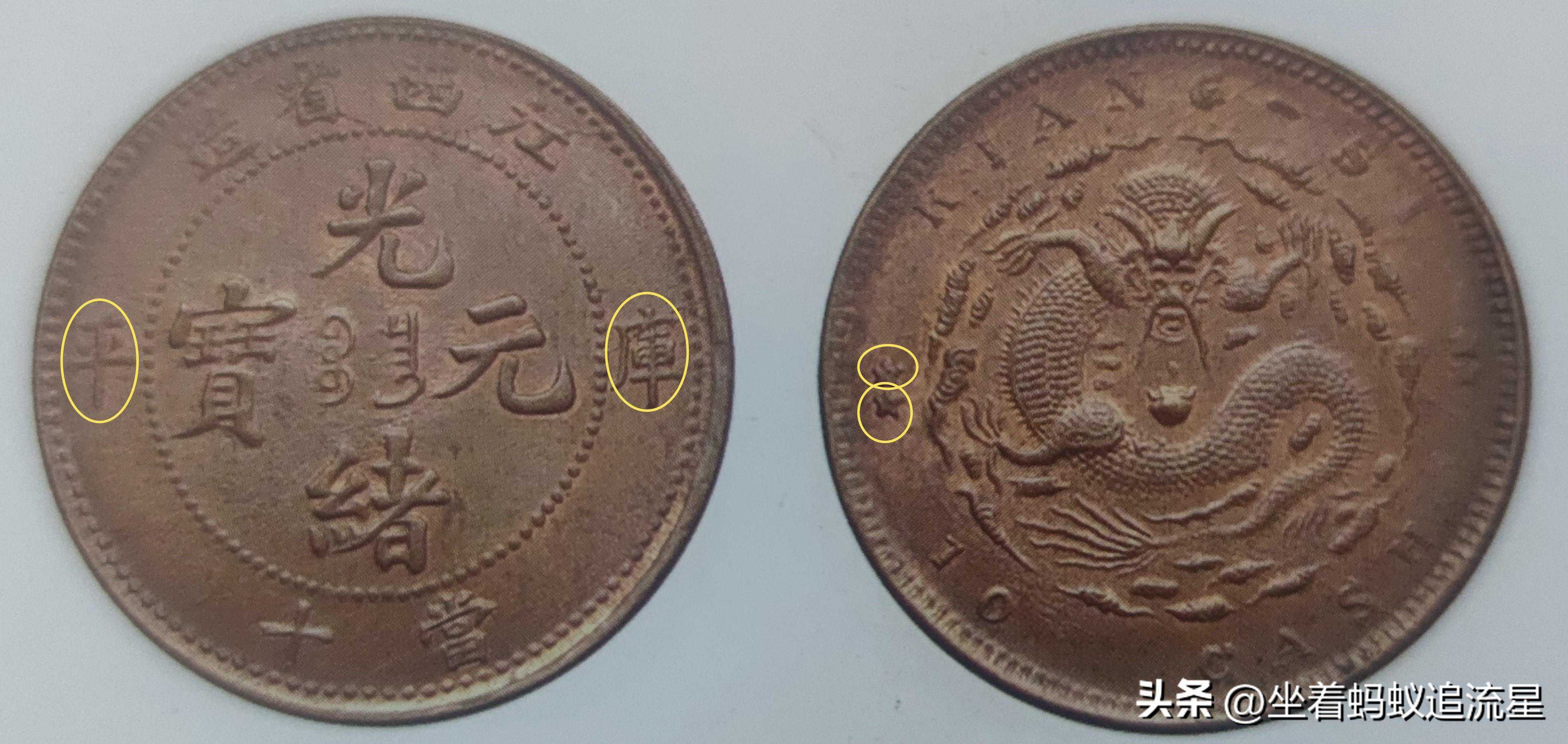 尔宝三星坐龙/5级(正面为:上缘铸“江西省造”,下缘铸“当十”,左右铸“库平”,中间铸“光绪元宝”四字,注意“寳”。背面龙图为坐龙,与其他坐龙不同的是,此版坐龙3点与9点钟方向是三颗星)