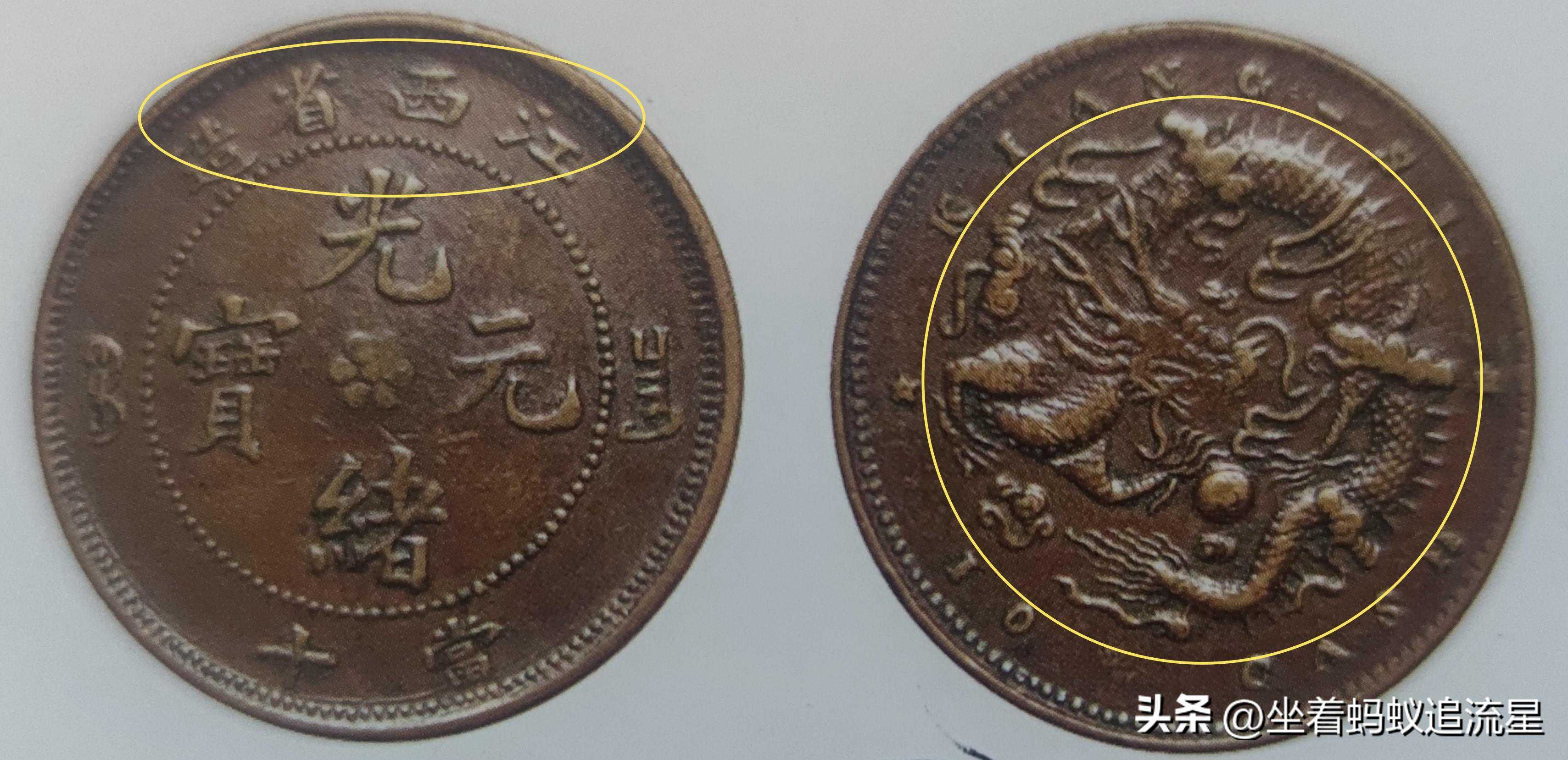库平水龙/9级(正面为:上缘铸“江西省造”,下缘铸“当十”,左右铸“库平”,中间铸“光绪元宝”四字。背面龙图为水龙)