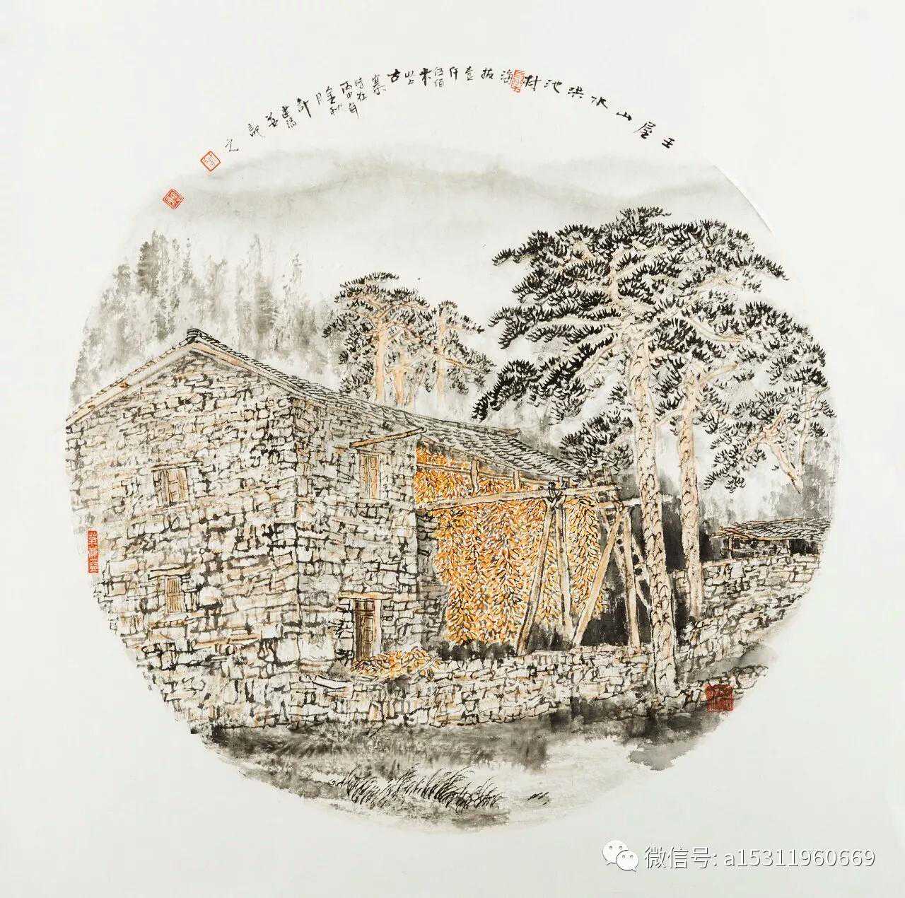 计建清的画,笔墨形式幅幅有变化,在熟谙的五笔七墨功技中,其体现了一种“瞻之在前,忽焉在后”的鱼龙变化,有难以捉摸之妙,他在运用上除了对自我表达的变化之外,更有一个“变”字,即用笔千变万化,却以中锋为主;线条遒劲挺拔,劲力内敛,沉着而力透纸背。他用笔古朴,无论是点景人物、房子还是船、桥、树等,古味随处可见。此外用笔简练也是计建清的特色之一,他所表述地对象,都以意象为主,从不把某种树表现为目的,不以哪座山为摹本去创作。而是高度概括,笔简意赅,写心中之山,心中之树,如人物,廖廖数笔,已把人物动态,拙味活灵活现得表现出来;如树石,随意随笔,但无不饱满灵动,笔之所到,既不繁复,也不觉少。他的用墨更显高超,他追求博大浑厚,创作时不惜层层复加。所以“浑厚华滋”成了他山水画的代名词。