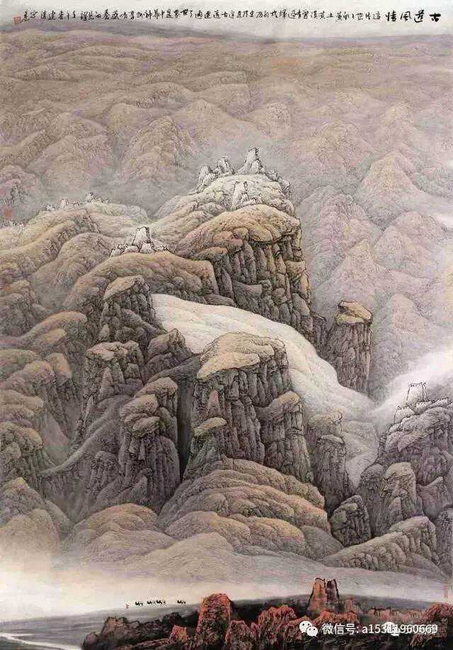 计建清创作的《关山雄风》,《古道奇观》《西部牧歌》作品中,浑厚华滋风格的手段主要是他特殊的笔墨追求。在他的笔下,墨成了自然的性灵,成了万物之光彩,“一墨大千”——千变万化的山川景色在他的笔下通过墨色充分表现了出来,且有许多出人意外的墨色韵味在画面上呈现。他作画常以浓墨、淡墨、焦墨、宿墨、积墨、泼墨、破墨法,有时数法并用,有时洗砚水、洗色碟水也统统用到画上去,用笔方法的变化极尽能事,这样便于笔墨的自然之中有些特别的机趣。