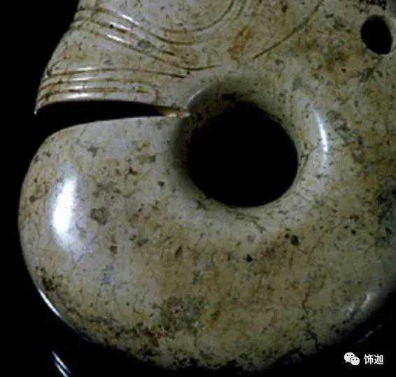 以上这几块玉制作时间在4000年至6000年前。这种玉器在刚出土的时候非常脆松。曾经有过刚出土的玉放入水中清洗时立即化掉,因此此种玉器如果有断面的话,你可以看到内部已经钙化。但如果恢复得好经擦拭有时也会出现光泽,见第二张图片。