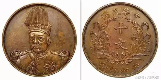 1912年3月,封建军阀袁世凯窃取了辛亥革命的胜利果实,当上了中华民国临时大总统。同年,天津造币厂根据财政部关于铸造纪念币的规定,铸造了袁像共和纪念十文铜元。按实物,此纪念币可分小面型和大面型两种版别。